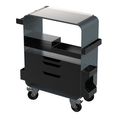 Kwadron’s, la postazione di lavoro modulare Impala offre un fissaggio con ripiani e cassetti indipendenti, permettendo all’artista di personalizzare la propria stazione in modo semplice e veloce. La postazione è montata su quattro ruote robuste bloccabili, rendendo semplici gli spostamenti nello studio. Tutte le parti della postazione di lavoro sono fatte di acciaio inox e ricoperte di una vernice di alta qualità per una durata maggiore e per facilitarne la pulizia. Questa postazione consiste in una struttura base esterna disponibile in quattro colori (Giallo, Verde Militare, Grigio e Nero), e di elementi modulari in nero lucido. Questa è la versione nera.